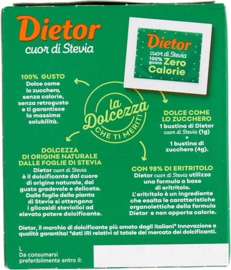 - My Dietor Cuor di Stevia подходит всем: от людей с непереносимостью глютена до тех, кто ищет достойную альтернативу сахару, и тех, кто хочет снизить потребление калорий.