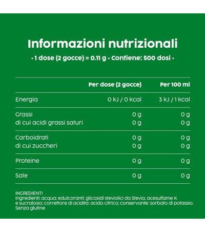 Состав: Вода; Подсластители: стевиолгликозиды из стевии, ацесульфам К и сукралоза; Регулятор кислотности: лимонная кислота; Консервант: сорбат калия. Без глютена.