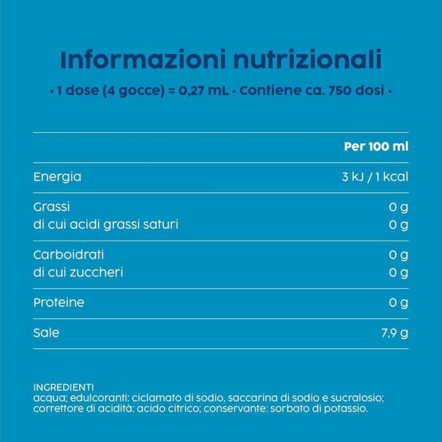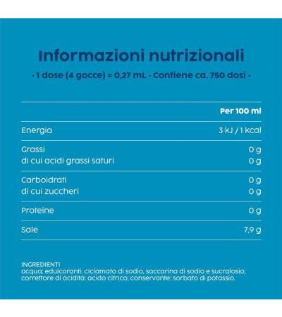 Состав: Вода, подсластители: цикламат натрия, сахарин натрия и сукралоза, регулятор кислотности: лимонная кислота, консервант: сорбат калия. Подходит для веганов и без глютена.